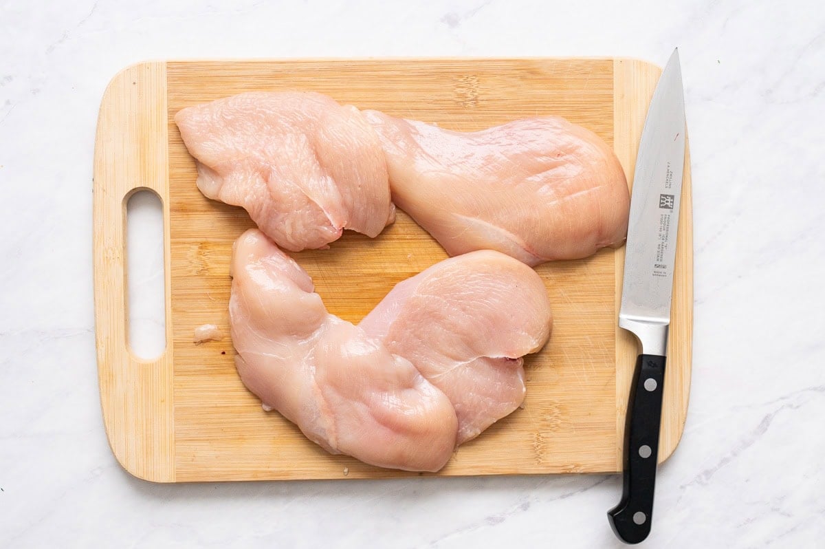 - Prep: Cut chicken breasts lengthwise into thinner cutlets and place in a large bowl. This step helps to avoid pounding the chicken.