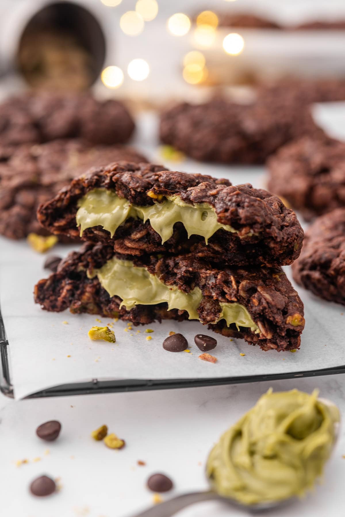 It’s based on my healthy oatmeal cranberry cookies but with addition of cacao powder. The sturdy chocolate cookie dough holds the pistachio cream center to mimic the Dubai chocolate bar, while still delivering soft, chewy edges and a rich, never dry texture.