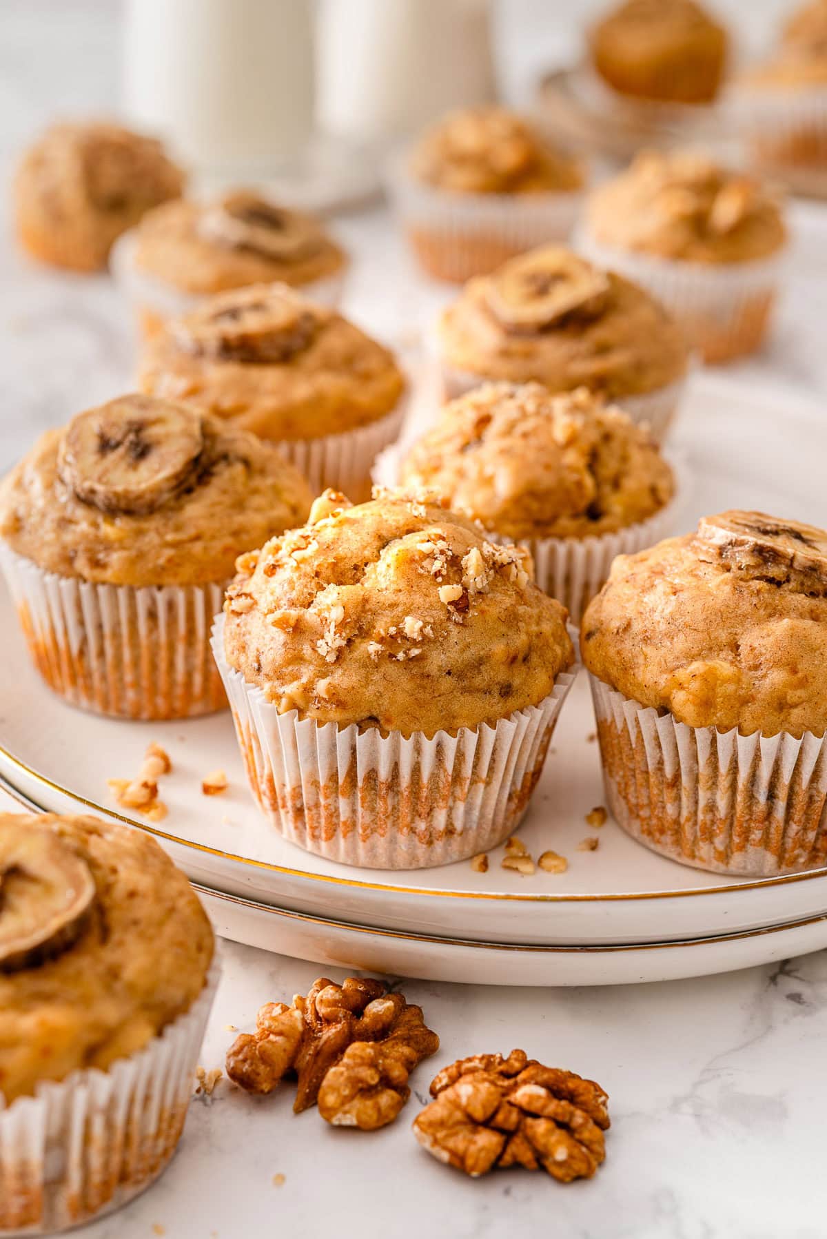 1 3/4 cups whole wheat flour, spelt flour, or white whole wheat flour. Gluten-free flour should work but you might need to add milk. - Walnuts: I love walnuts in banana muffins recipes specifically but chopped pecans will be delicious too.