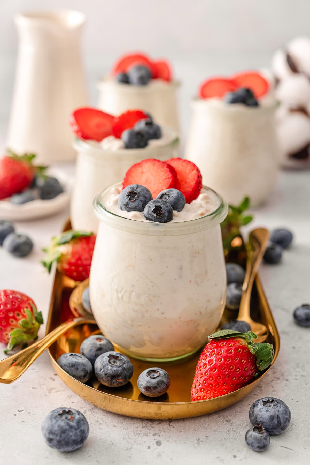 Greek yogurt overnight oats in jars garnished with berries.