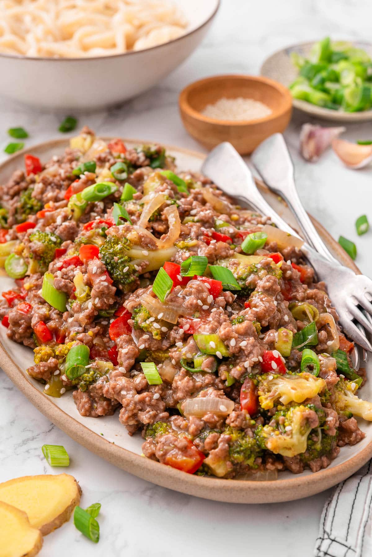 The sauce is plenty and sticky and almost identical to my beef stir fry recipe. One night we were dying for a change, so I tossed in udon noodles at the end. The sauce clung to them and my family declared this ground beef stir fry recipe the best stir fry I’ve ever made!