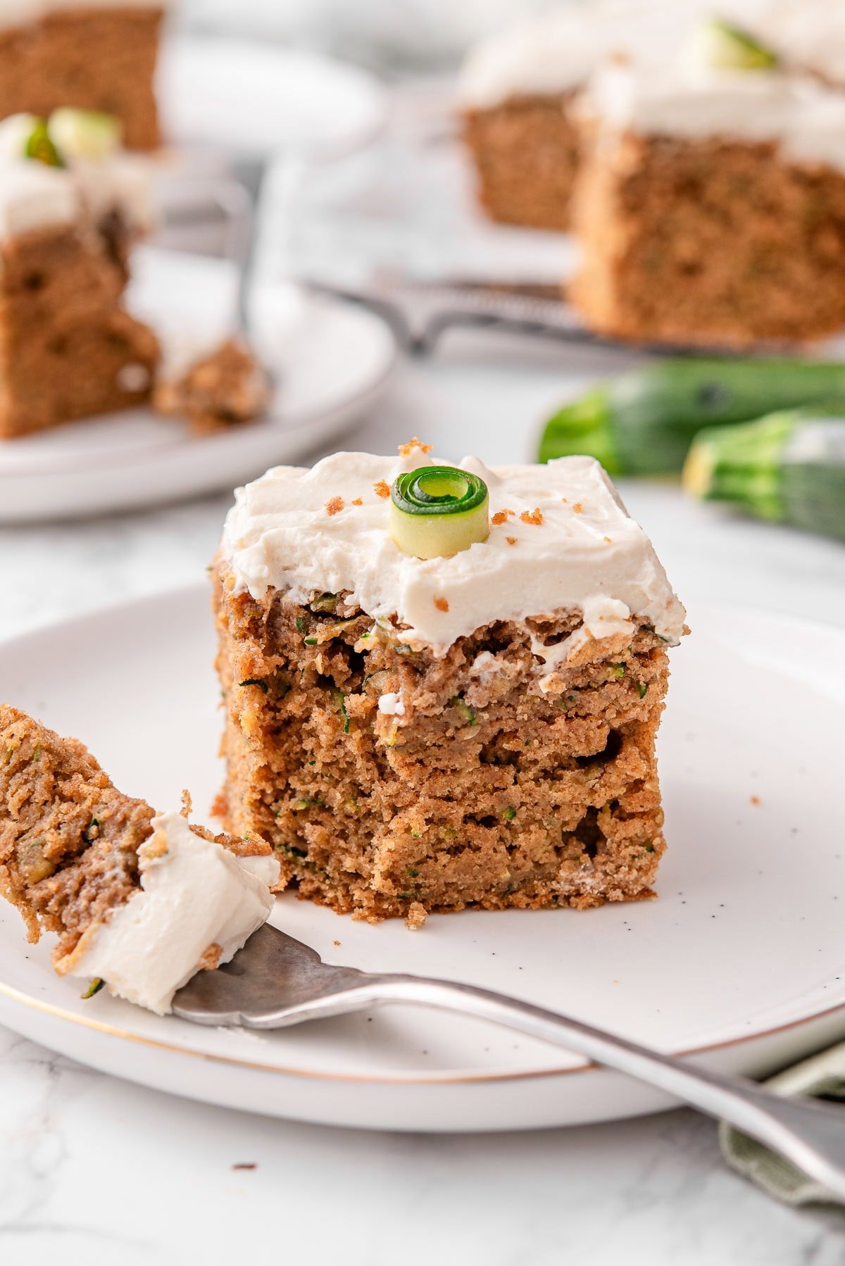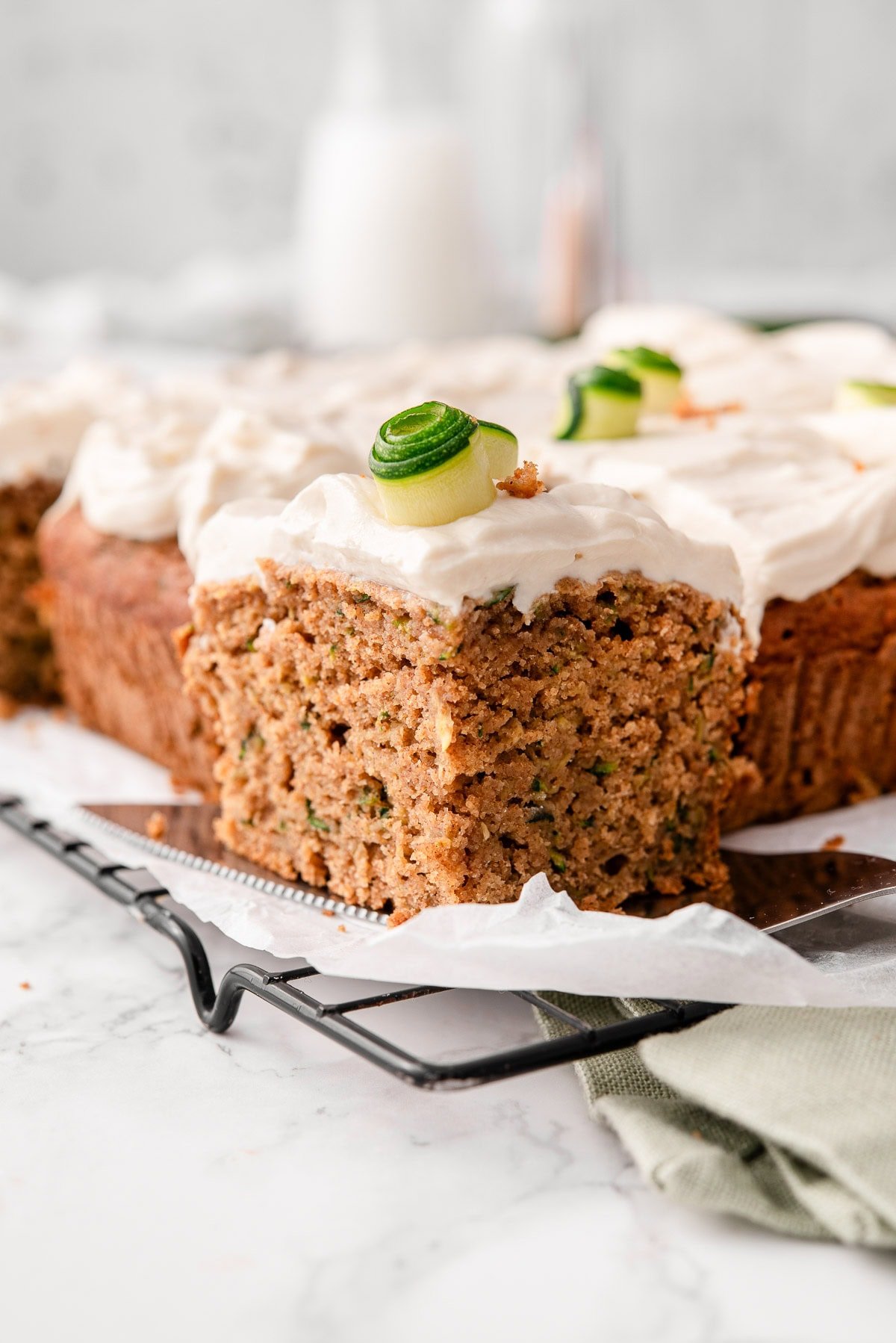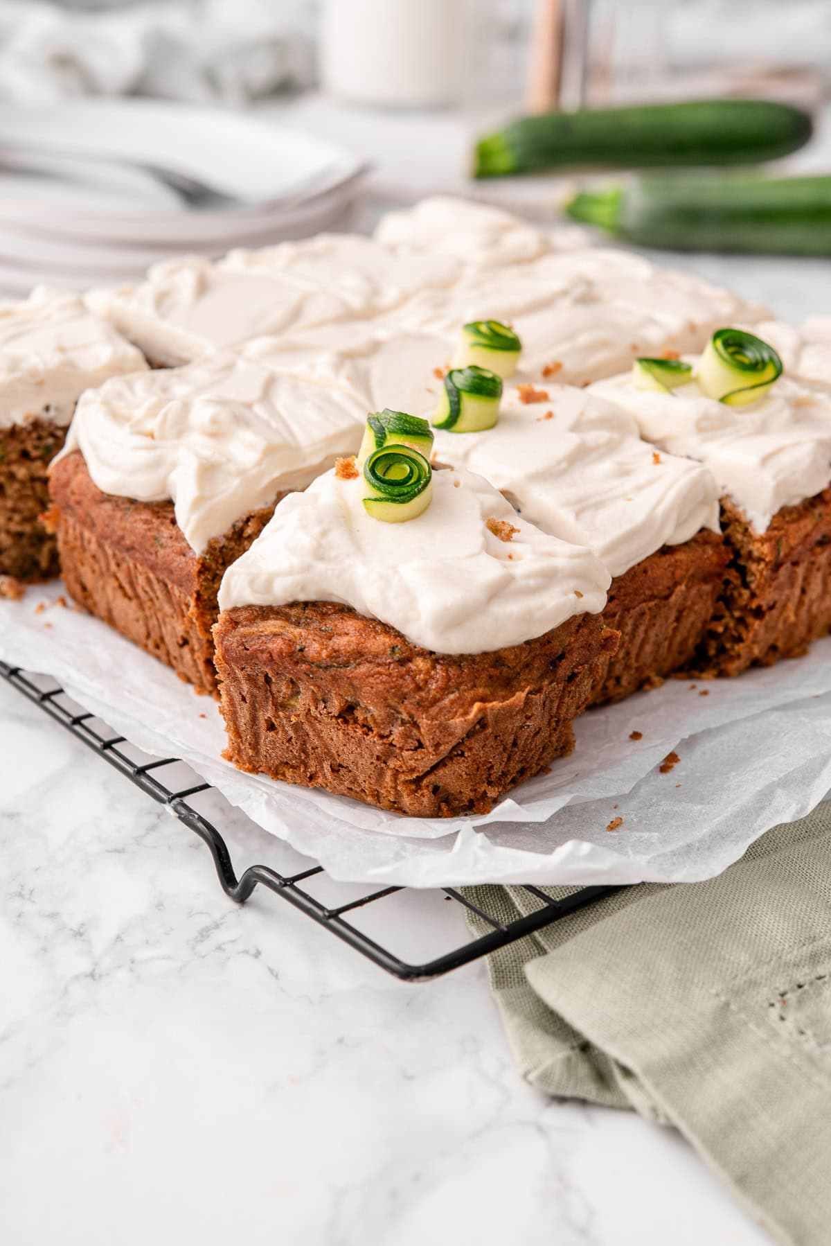 - Frost the cake: Spread the frosting evenly over the cooled zucchini cake, cut, and enjoy!