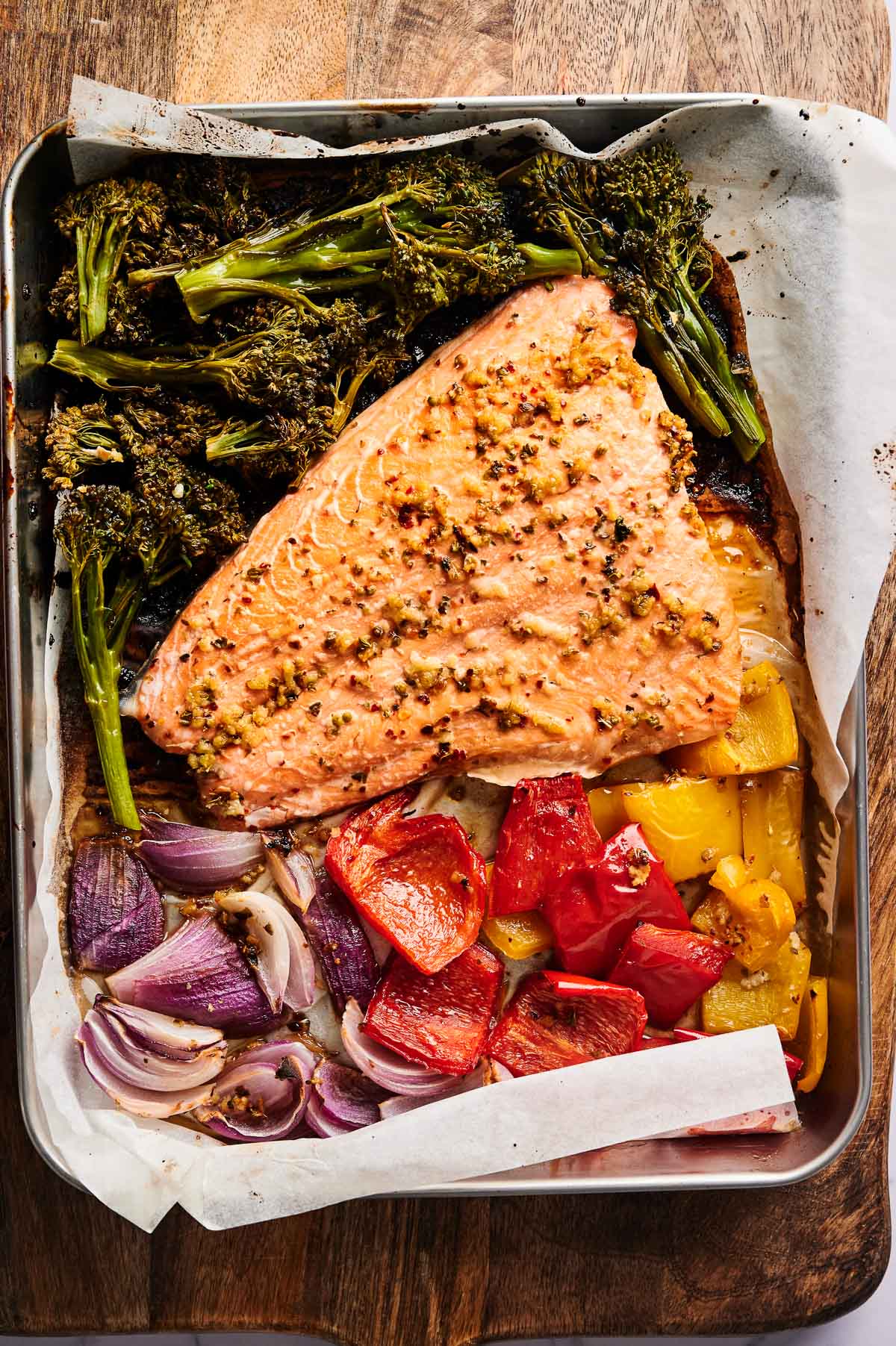 I use the same sauce on the salmon and vegetables, so it’s super quick, and the fish comes out flavorful with zero marinating! Everything cooks on one baking sheet for minimal cleanup.