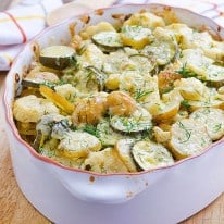 This Zucchini Potato Bake combines zucchini and potatoes with sour cream or Greek yogurt, garlic and dill for a healthy, wholesome casserole!